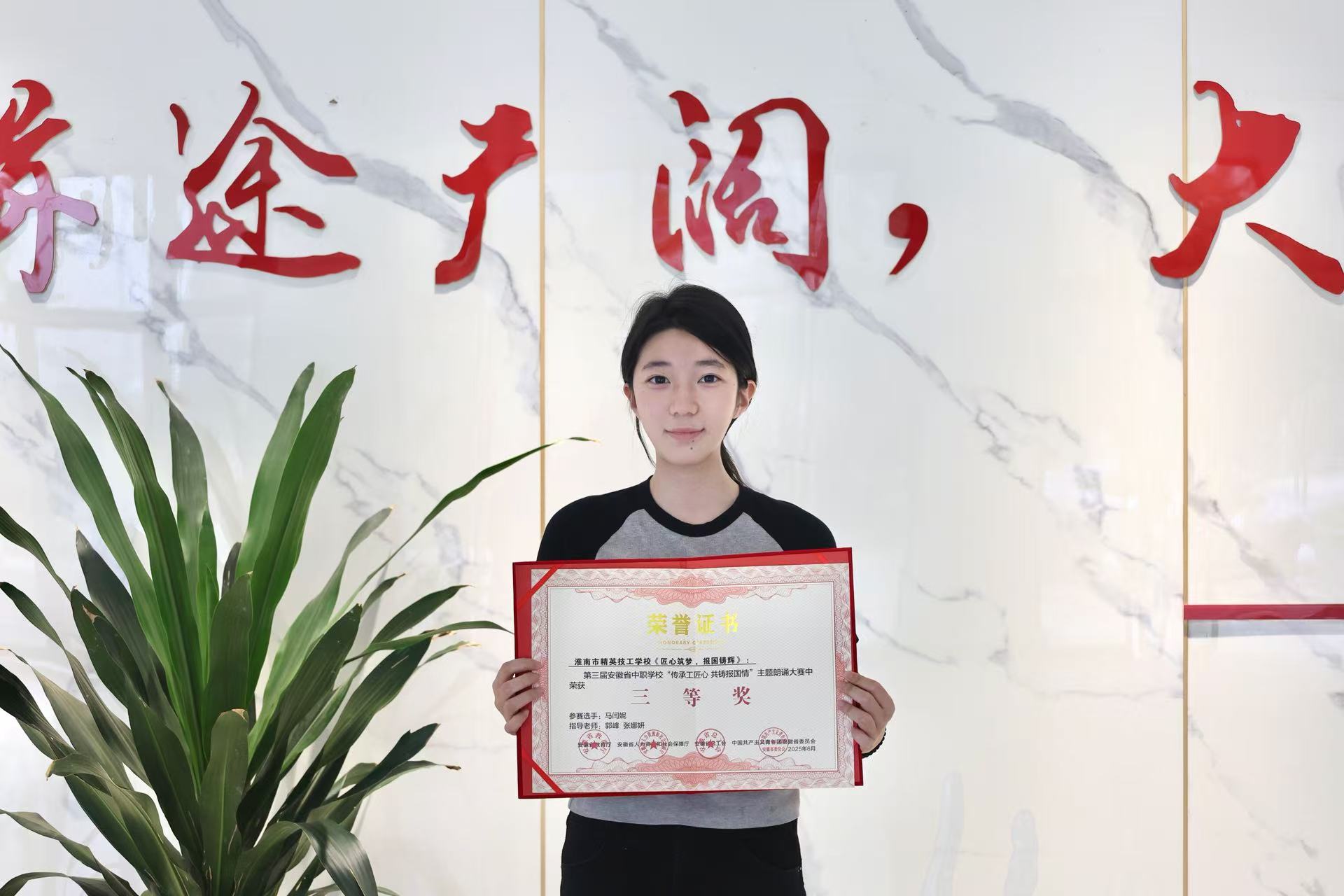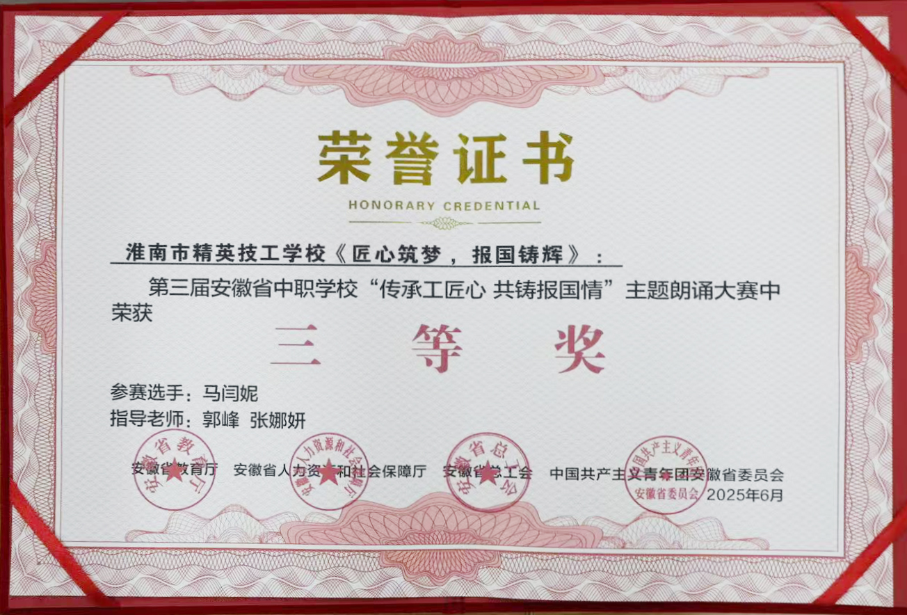近日,第三届安徽省中职学校“传承工匠心 共铸报国情”主题朗诵大赛落下帷幕,我校24级升学1班马闫妮同学凭借作品《匠心筑梦,报国铸辉》,在省级朗诵比赛中荣获三等奖。
