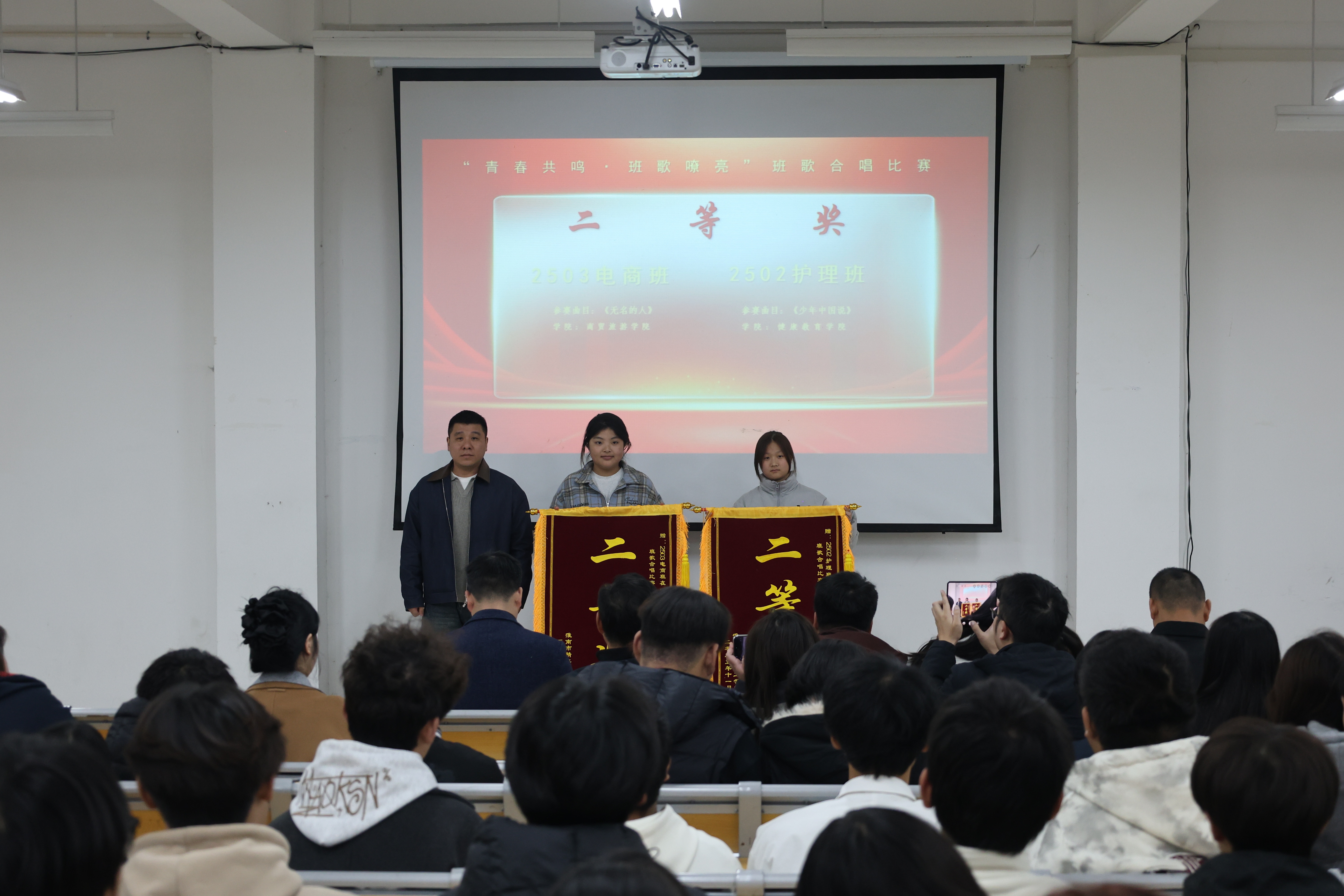 “青春共鸣·班歌嘹亮”合唱比赛自启动以来,吸引全校新生班级踊跃报名。历经初赛、决赛两轮激烈比拼,各学院代表队站上最终领奖台。其中,商贸旅游学院2501会计班以一曲《我乘着风飞过来》斩获全场最高分,成功加冕一等奖;商贸旅游学院2503电商、健康教育学院2502护理班班荣获二等奖;智慧交通学院2501城轨班、2509新能源班及健康教育学院2503形象设计班分获三等奖。校长助理任俊岭为一等奖班级颁发锦旗,并寄语同学们“把青春唱给祖国听,把理想写在新时代”。